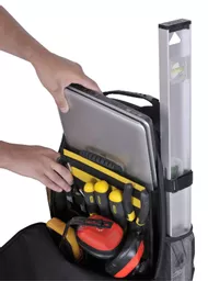 The STANLEY® Backpack features a wide opening zip design for quick and convenient access to tools, along with a removable tool organiser with a carry handle, for organisation of small tools. The backpack has two padded shoulder straps which provide comfort whilst carrying heavy loads, as well as multiple pockets including a padded compartment for a laptop or tablet and a front zip compartment to keep personal items secure. Long tools such as spirit levels can be carried in the helpful tool loop. Made from heavy duty 600 denier fabric for long lasting durability.